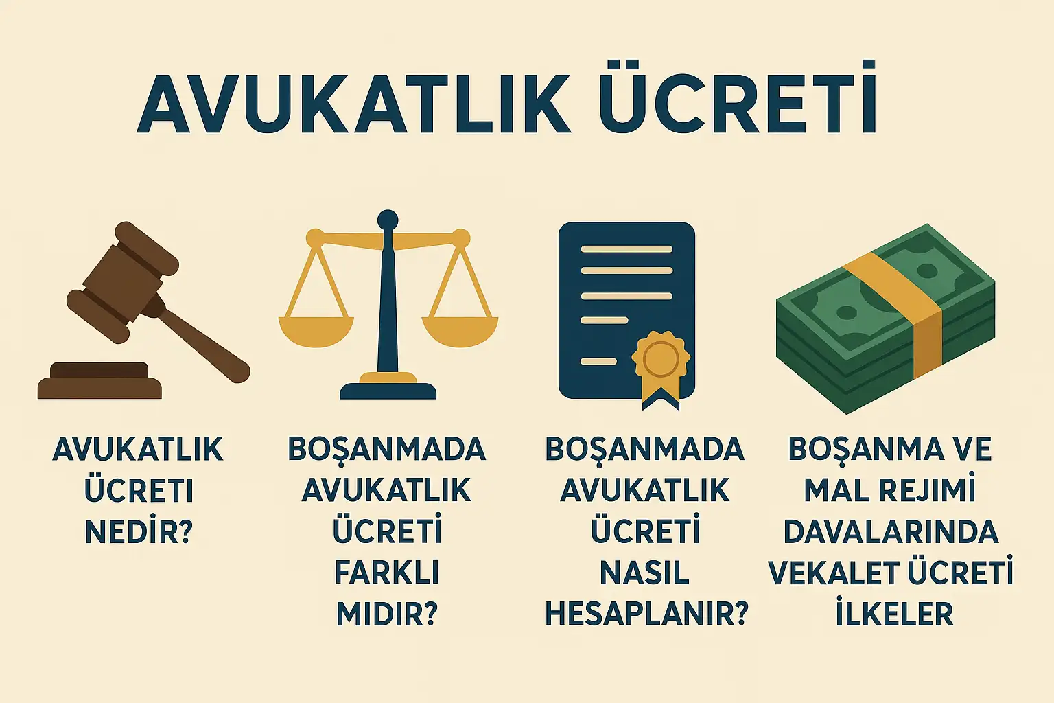 Boşanmada avukatlık ücreti, avukat ile müvekkil adayı arasında serbestçe düzenlenir. Yazılı olması şart değil ise de “söz uçar yazı kalır” ifadesinin gereği olarak yazılı düzenlenmesi yerinde olur. Öte yandan müvekkil adayları haklı olarak ücretin önceden bilinmesini ve pahalı olmamasını isterler. Ne var ki avukatlık hizmeti her olay ve her davanın özelliklerine göre değişir. Başka deyişle nicelikli yani ölçülebilen, sınırlı, önceden öngörülebilir bir hizmet olmadığı için bu ücretin herkes için sabit olmasını beklemek adil olmaz.Bu yüzden perakende bir ücret beklentisi içinde olunmamalıdır. Avukatlık ücretinin belirlenmesinde temel ilke adil olunmasıdır. Verilecek hizmetin niteliği, süresi, aşamaları, müvekkile kazandırılacak değerler ile avukatın harcayacağı zaman, emek ve bunlar kadar önemli olan bilgi ve deneyimi de hesaba katılmalıdır. Rivayete göre Picasso, birkaç dakika içinde çiziktirdiği bir resim için istediği yüksek ücreti garipseyen birine, o birkaç dakikanın üstüne kırk yıllık çalışma ve deneyimimi de ilave edin demiştir. O halde avukatlık ücreti belirlenirken, davanın organik bir süreç olduğu, durağan olmadığı, avukatın gelişen yeni durumlara göre inisiyatif kullanabilme yeteneği, özcesi verilecek hizmetin niceliği yanında niteliği de gözetilmelidir. Nitekim olan dava dilekçesinin veya cevabının yazımından itibaren tüm aşamalardaki dilekçelerde olduğu gibi duruşma aşamasında da müvekkillerin haklarının sonuna kadar savunulması, hak kaybı yaşanmaması için Avukatın aldığı ücretin, müvekkiline kazandıracakları ile uyumlu olması, yani adil olması çok değerlidir.-Boşanma ve mal rejimi davalarında vekalet ücretinin belirlenmesine hakim olan ilkeler